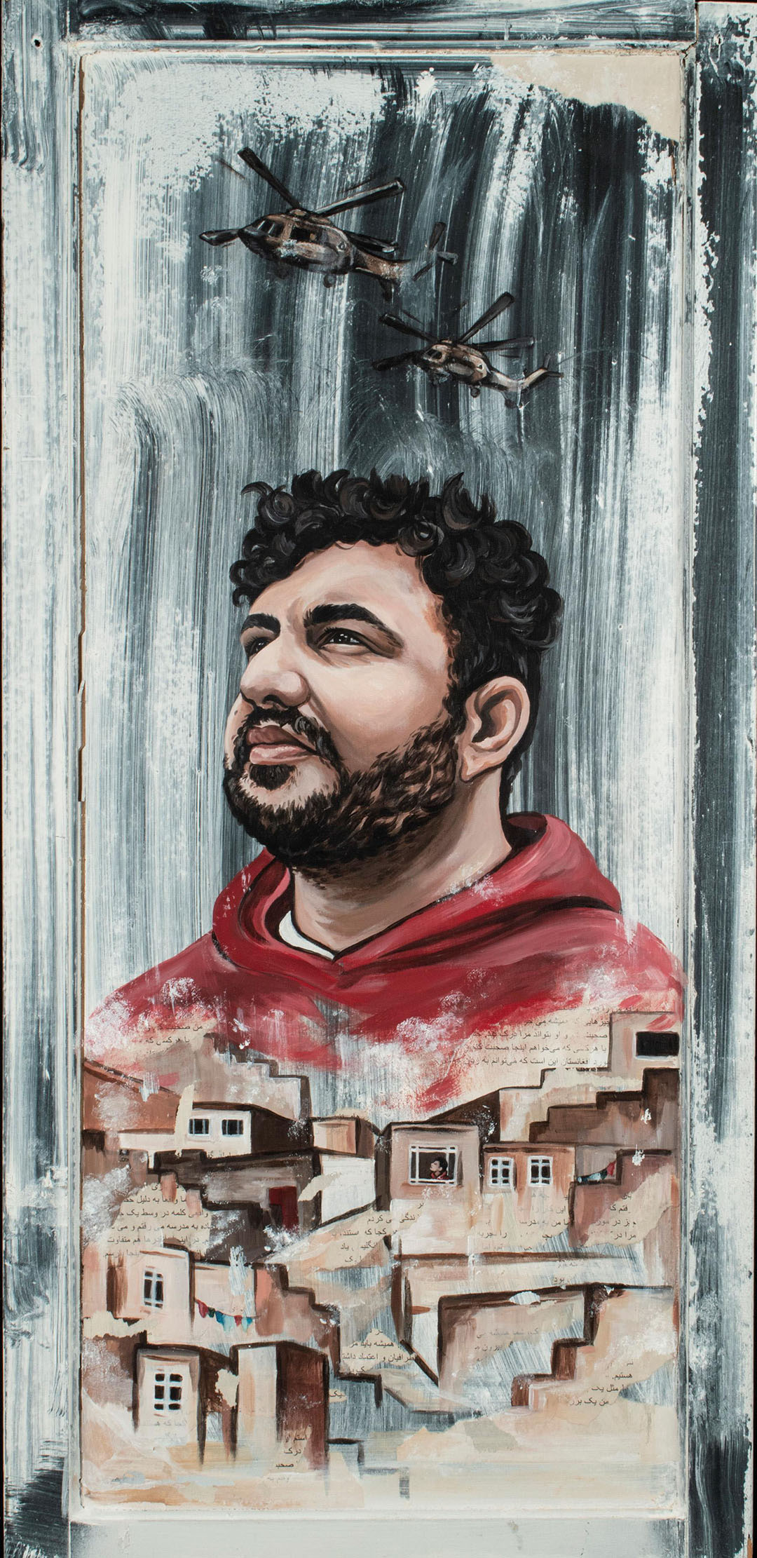 This image depicts the subject looking upwards, reflecting on the memory of the day his city was bombed. His mother was walking to work, and he remembers looking out the window, wondering if she was safe amid the chaos. The mixed media piece depicts him leaning out the window, watching helicopters fly over. The image is meant to evoke warmth and nostalgia as well as uneasiness and loss. Parchment paper is ripped and painted over to create layers of texture as if seeing through the debris of a memory.