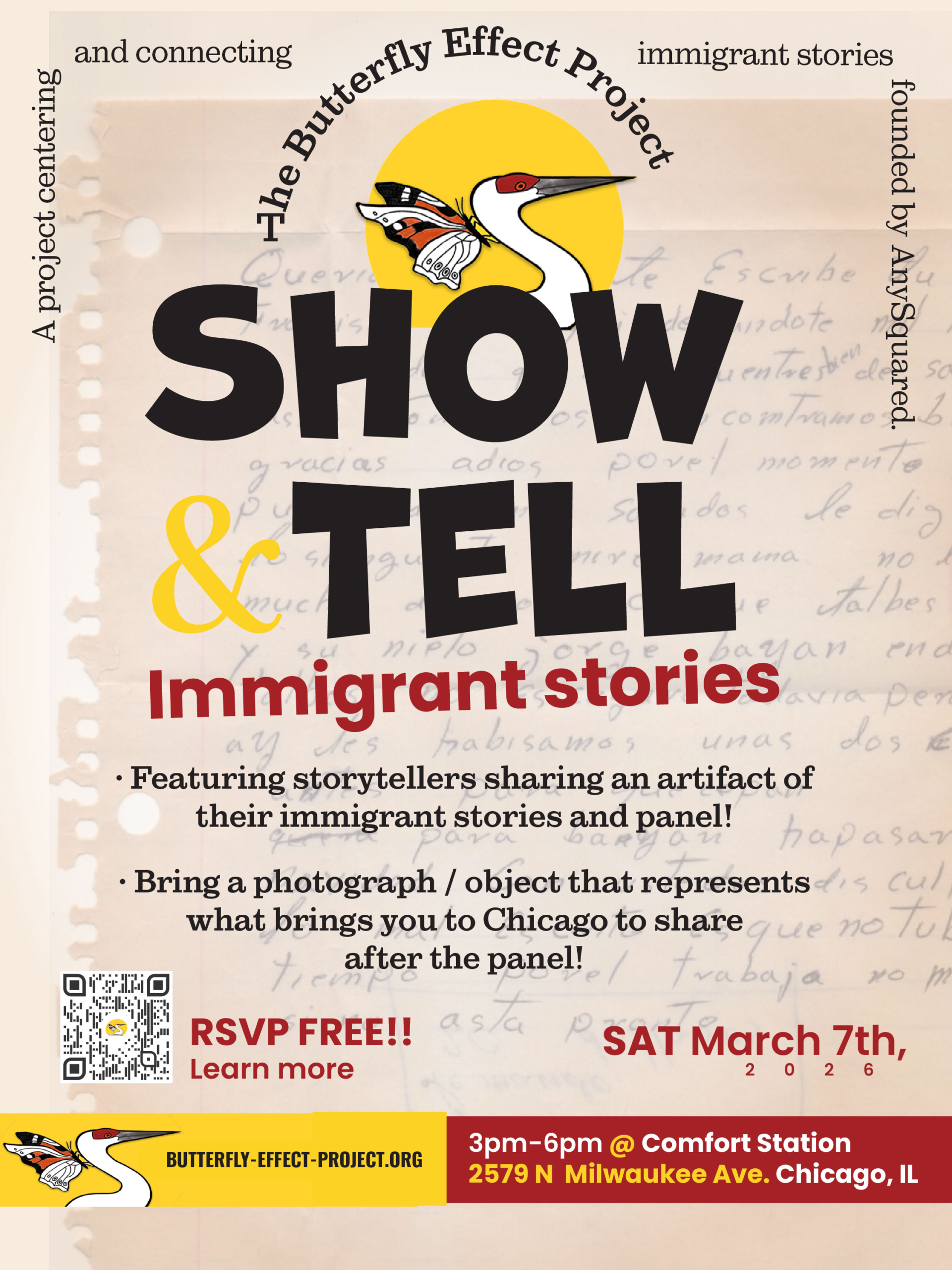 Event features storytellers sharing an artifact of their stories and a panel! Bring a photograph/object that represents what brings you to Chicago to share after the panel!